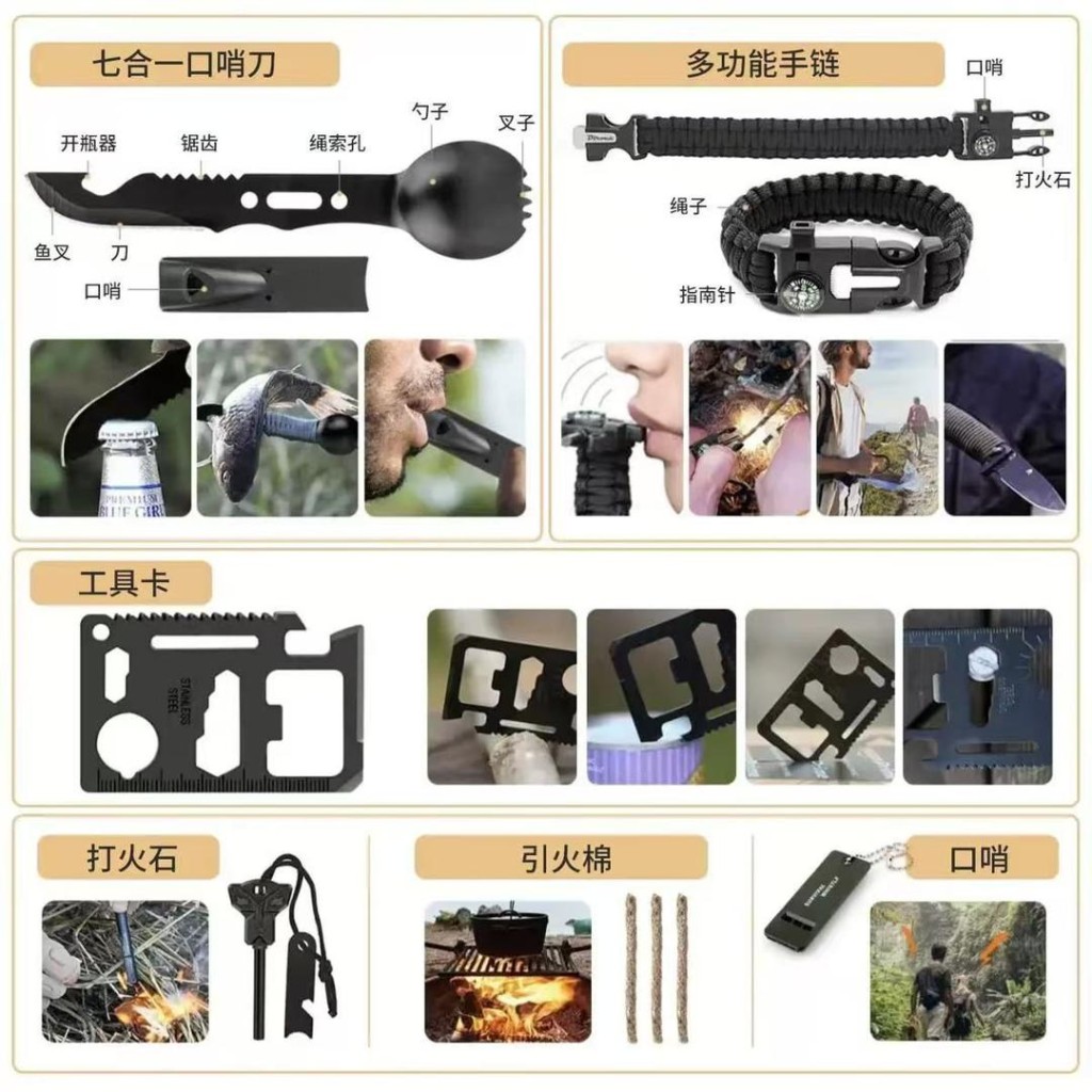 - ابزارهای چندکاره: چاقوهای تخصصی (با کاربریهای مختلف)، انبردست، چکش فولادی، اره دستی، قیچی، کارت چندمنظوره و...