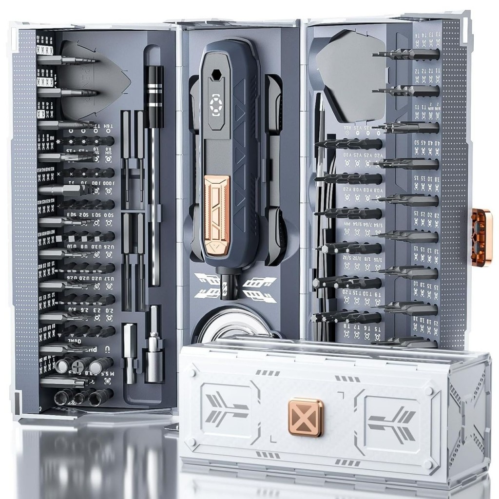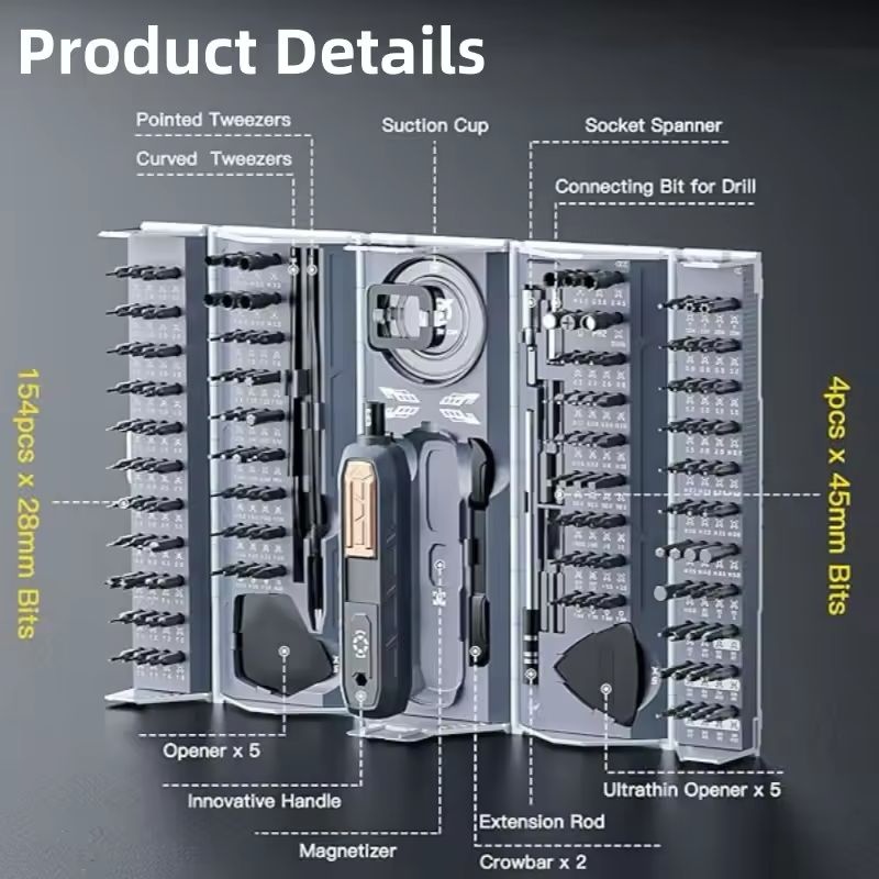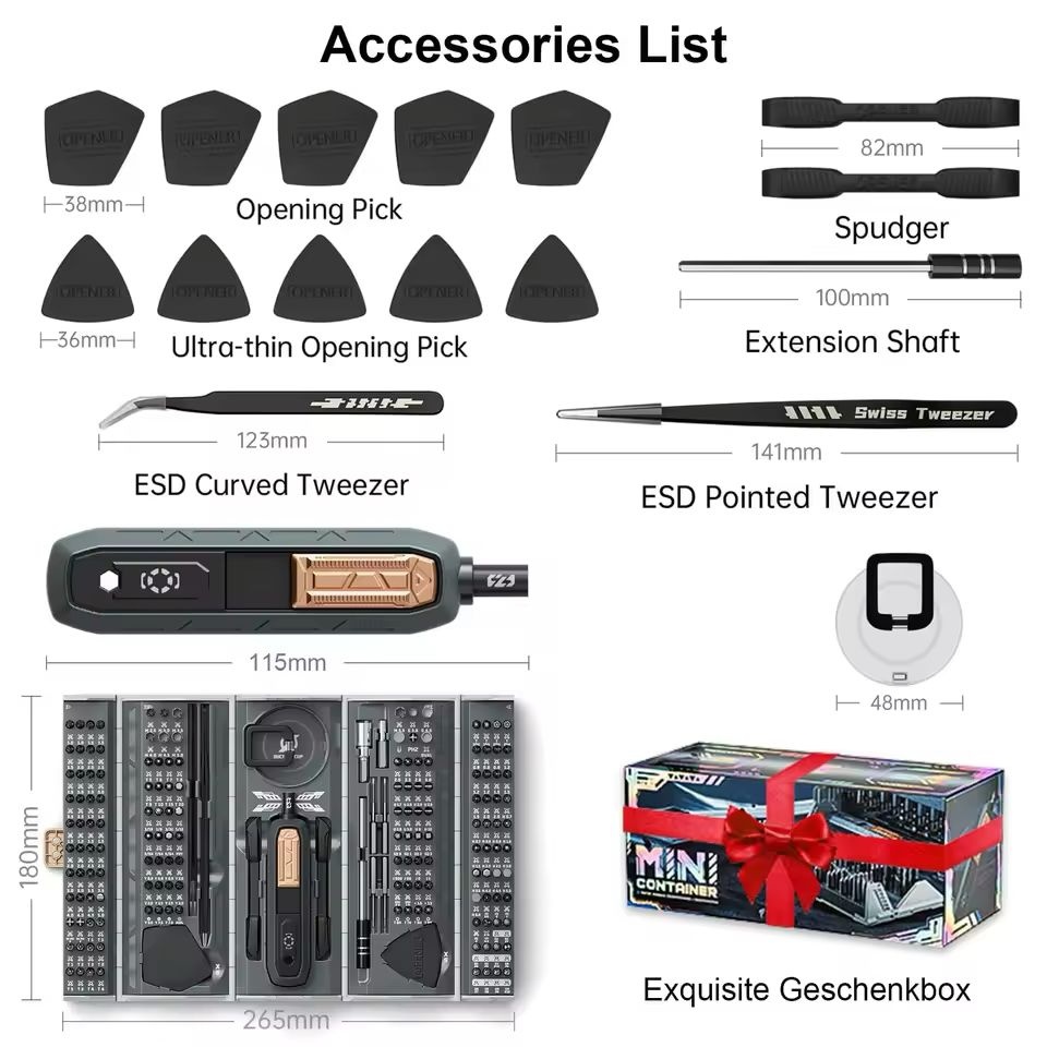 - لوازم جانبی کامل: این مجموعه شامل ۱۳۲ سرمته و ۱۲ غلاف مختلف، به همراه ابزارهای جانبی متنوعی مانند مکنده، موچین، دیلم و مثلث پیچ است.