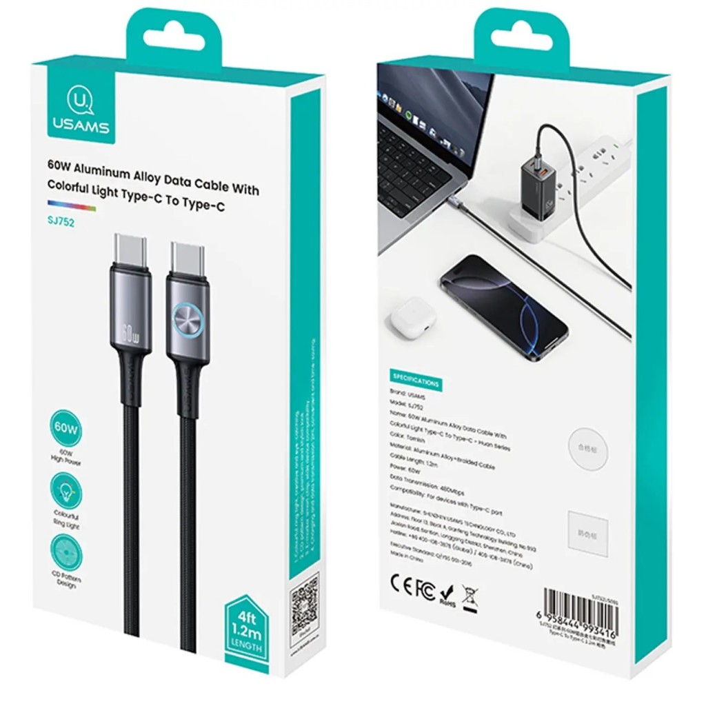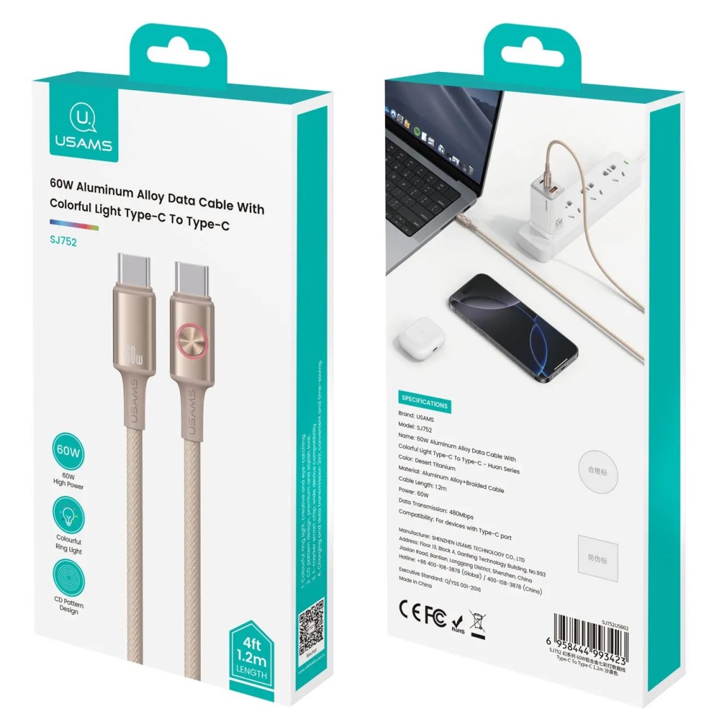 این کابل Type-C به Type-C از برند یوسامز، مدل SJ752، با طول 1.2 متر، برای شارژ و انتقال دادههای سریع طراحی شده است.