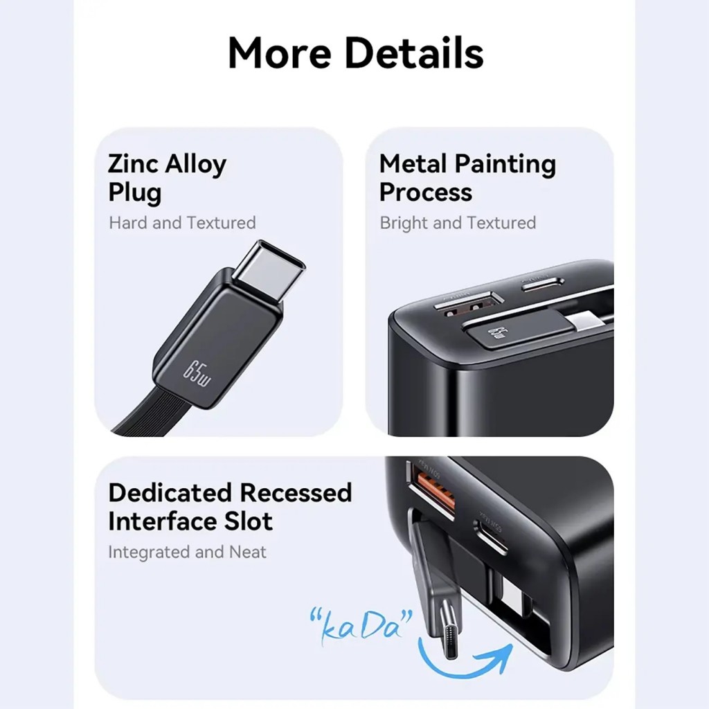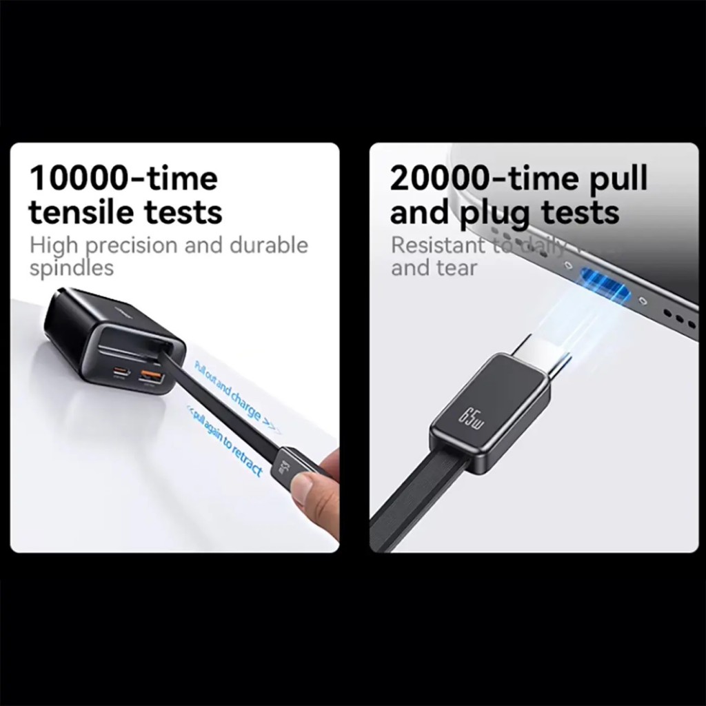- خروجیها: دارای یک پورت USB-A و یک پورت Type-C، بهعلاوه کابل Type-C جمعشونده متصل.