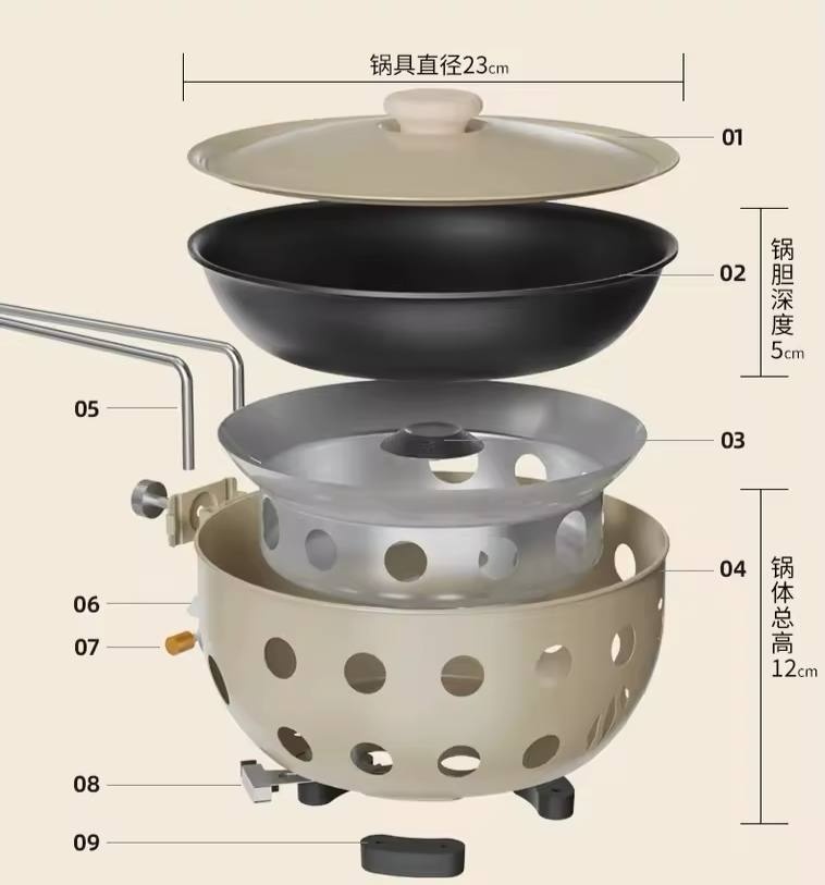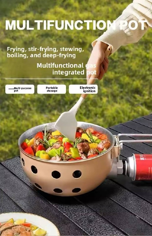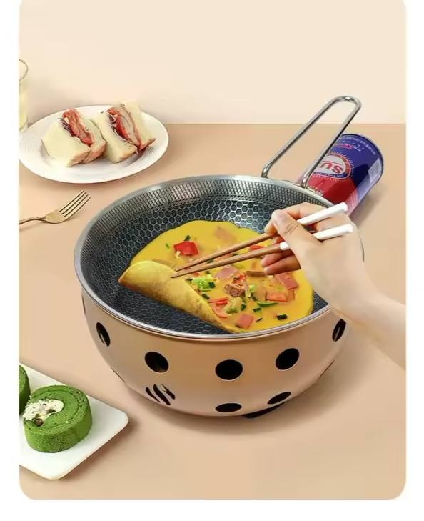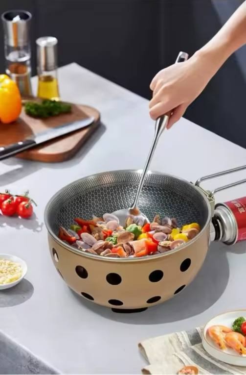 اجاق گاز قابل حمل برای کمپینگ همراه با یک ماهیتابه استیل ضد زنگ فشرده و جمعوجور، یک راهکار ۲۳۰۰ واتی برای آشپزی آسان و راحت در فضای باز است.