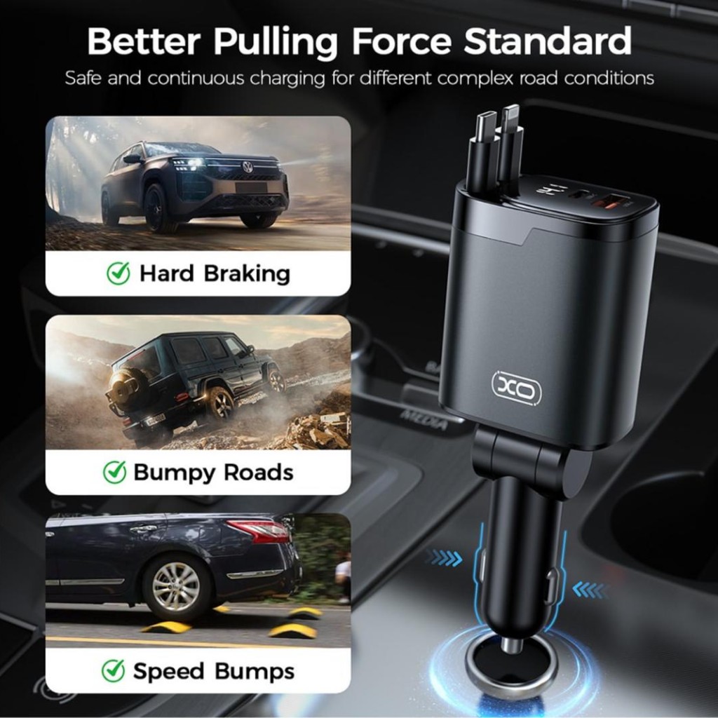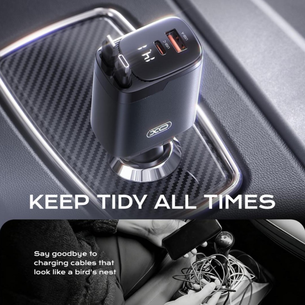 شارژر فندکی خودرو 4in1 مدل XO-CC71 با کابلهای جمعشونده – توان 108 وات